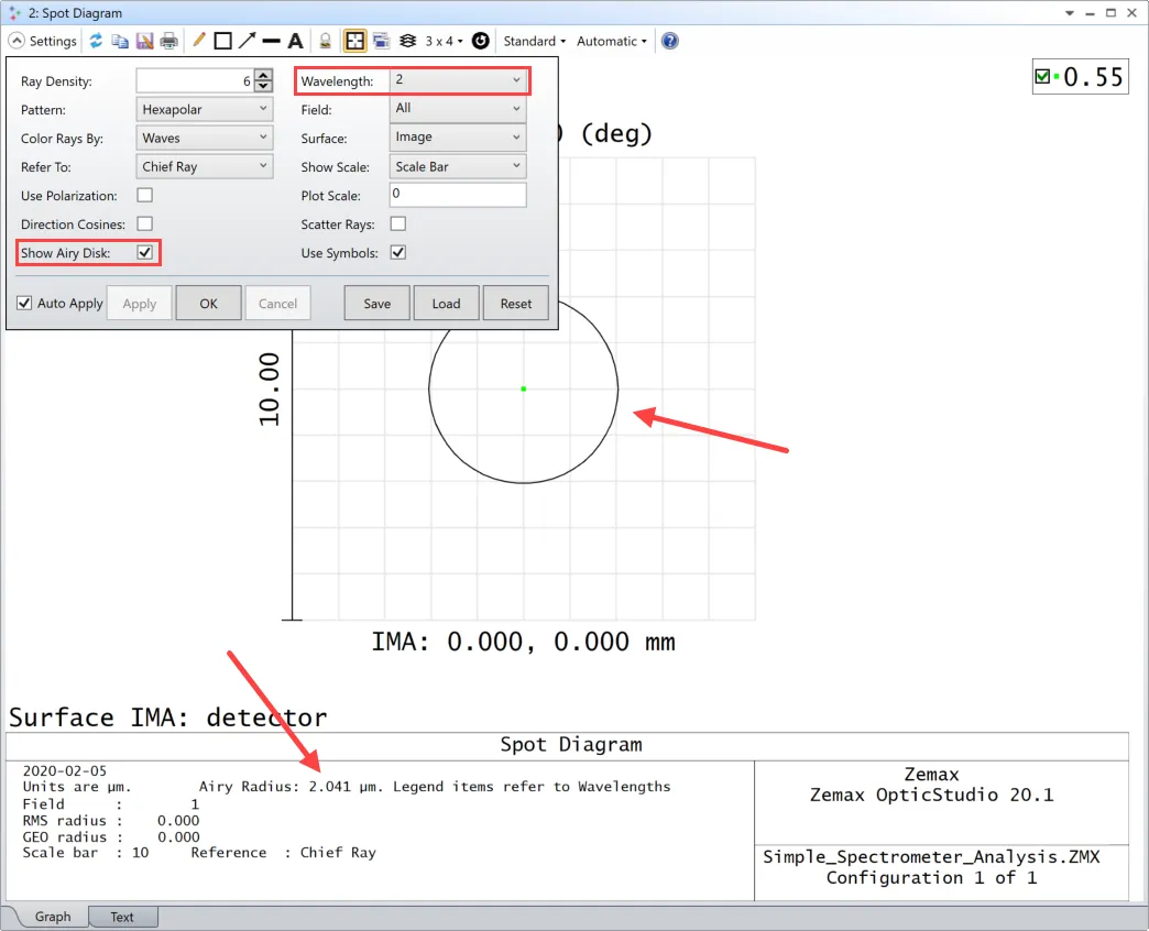 OpticStudio有各种各样的工具来分析衍射。此处考虑了点列图中的艾里斑(Airy disk)(衍射极限的点列斑尺寸),其数值在点列图注释中: