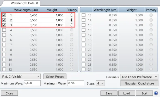 在此光谱仪中,要分析波长范围为:λmin=400 nm到 λmax = 700 nm的可见光,波长带宽为:Δλ= 300 nm。因此,设置三个波长,其中两个波长处于光谱的边缘,中心波长为:λ0 =550 nm,后者为主波长: