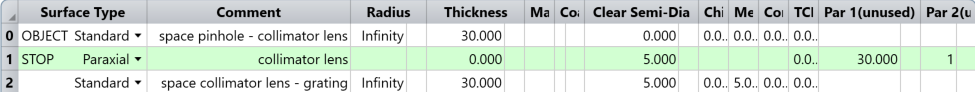 完成以上操作后,可以继续使用光谱仪中的第一个元件,并在镜头文件中添加第一行。假设光来自点光源(对应于针孔)。使用焦距为30 mm的近轴透镜,将其置于针孔后30 mm处,将产生准直光束。插入另一个厚度为30 mm的表面,以表明准直透镜和衍射光栅之间的距离: