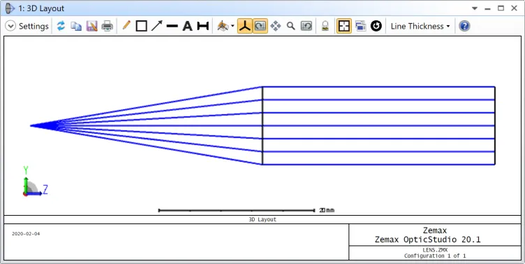 可以看出光斑尺寸非常小,这仅仅是因为我们选择了近轴透镜并使用了几何光线追迹才有可能实现。在真实情况中,由于衍射效应,会使光斑更大。这就是本文的最后一部分将要讨论的内容。但是,我们先要仔细观察聚焦透镜和探测器,以了解它们的尺寸。