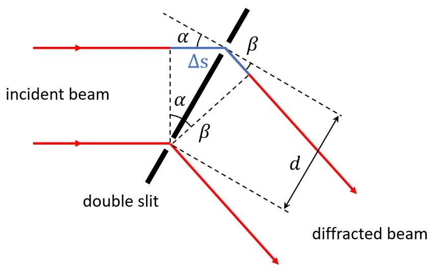 已经对入射光束进行了准直,所以光束中的所有光线彼此平行。如果考虑穿过两个狭缝(红色箭头)的两条光线,我们可以计算这两条光线(蓝色部分)之间路径差Δs ,它是两个狭缝之间的距离 d ,入射角 α 和衍射角 β 的函数: