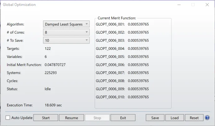 点击优化 ( Optimize) > 全局优化 ( Global Search )打开全局优化窗口,并开始优化,只需几秒钟就可以找到系统的全局最优解: