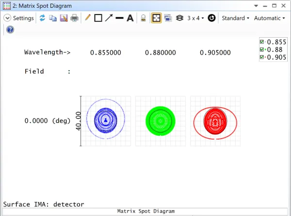 然而,查看矩阵点列图 ( Matrix Spot Diagram ) 发现:在中心波长(880 nm)处的光斑大小接近衍射极限(以黑色圆圈表示艾里斑),但在其他波长处还没有接近衍射极限。