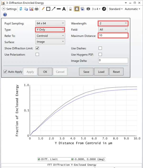 但是如果查看圈入能量分数(Fraction of Enclosed Energy)(通过点击:分析(Analyze)>像质分析(Image Quality)>圈入能量(Enclosed Energy)>衍射(Diffraction)打开),我们会发现已经接近系统的衍射极限了: