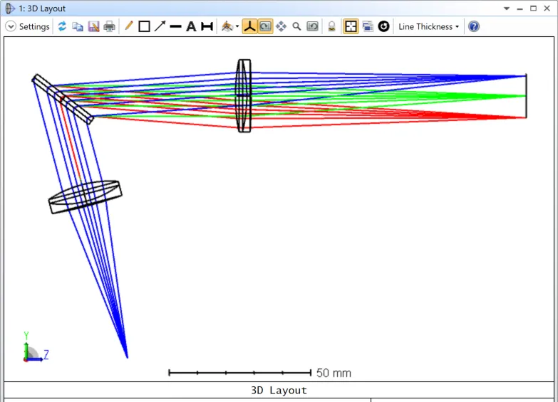 将表面0的厚度更改为55.718 mm(对应厂家指定的后焦距),检查三维布局图确认镜头准直后的光束: