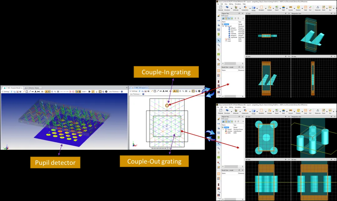 打开这个文件时,我们应该看到两个Lumerical FDTD被打开,只要OpticStudio。这是因为该系统定义了两个光栅。一种是带有圆形区域的一维倾斜光栅,用于在光线中耦合。一种是带有矩形区域的二维六边形光栅,用于耦合光线。