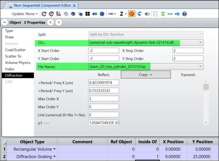 通过检查物体 2 >物体属性>衍射,可以看出选择了“lumerical-sub-wavelength-2023R1.dll”来定义衍射属性。在“文件名”的下拉列表中,可以看到选择了lswm_1D_slant.fsp。下拉列表将显示保存在文件夹 \Document\Zemax\DLL\Diffractive\ 中的所有 fsp 文件。