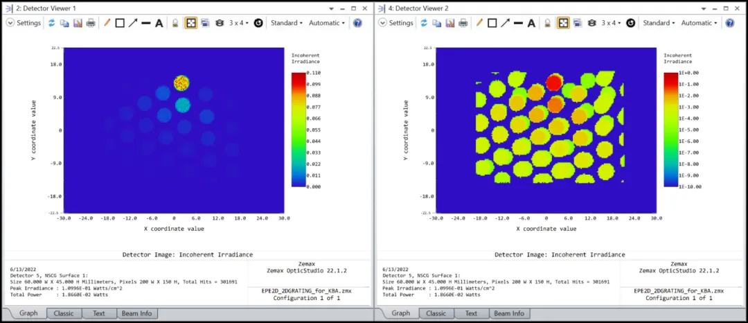 探测器上的光线追踪结果如下。请注意,两张图片显示的结果相同,但右侧是用对数刻度。