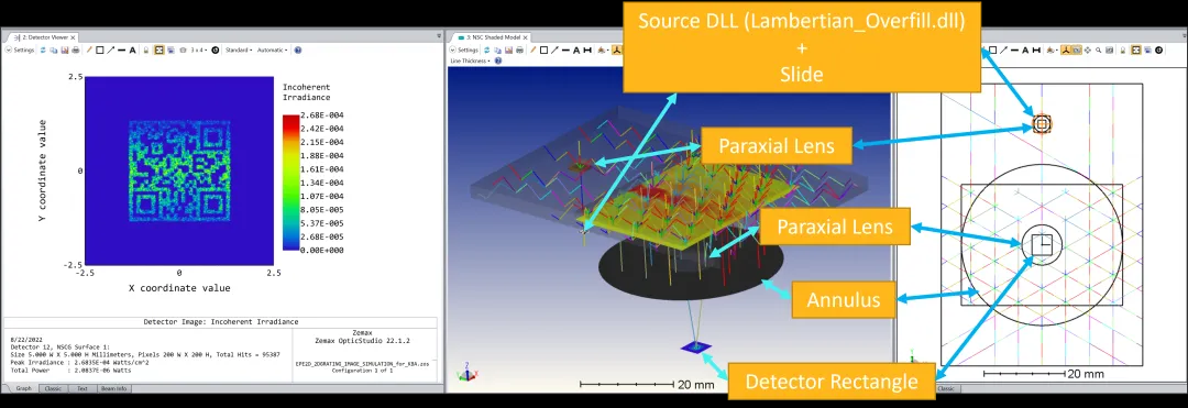 在此文件中,添加了多个对象以进行图像模拟。我们用一个图像源替换了准直光,该图像源包括 3 个对象、源 DLL (Lambertian_Overfill.dll)、幻灯片和近轴透镜。近轴透镜放置在第一个耦合光栅的正前方。它将在其焦平面上将图像投射到无限远。源 DLL 和幻灯片都位于焦平面上,但略有偏差,因此这两个对象不会完全重叠。源 DLL 使用Lambertian_Overfill.dll,其大小与第一个耦合光栅处的幻灯片和目标瞳孔相匹配。幻灯片只是一个用于测试图像质量的二维码。