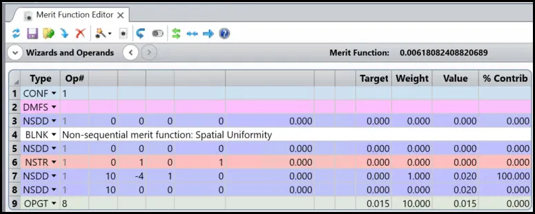 在评价函数中,第 7 行计算非零像素上辐照度的标准偏差。这个数字越低,系统的均匀性就越好。第 8 行和第 9 行将总效率限制为大于 0.015。