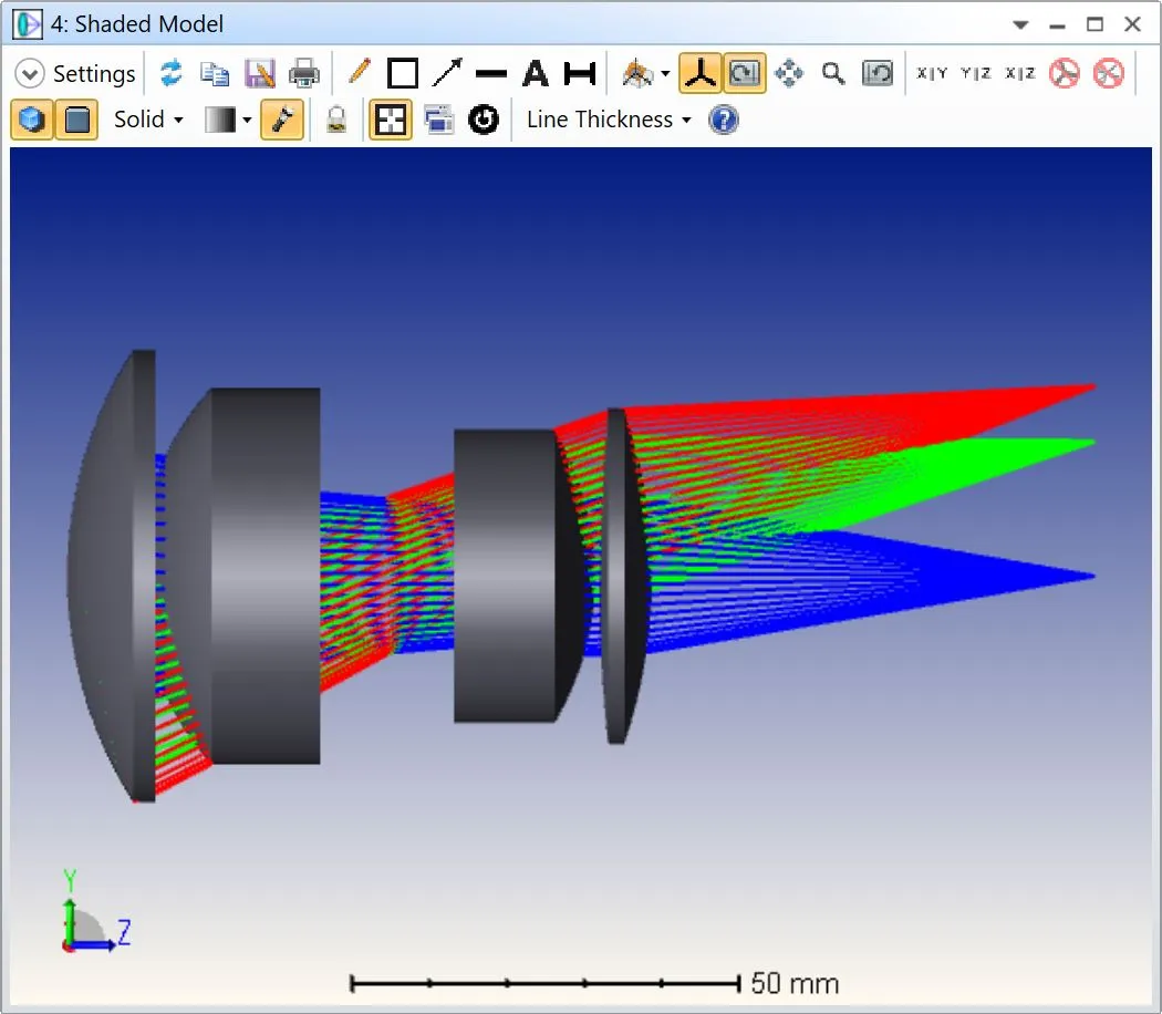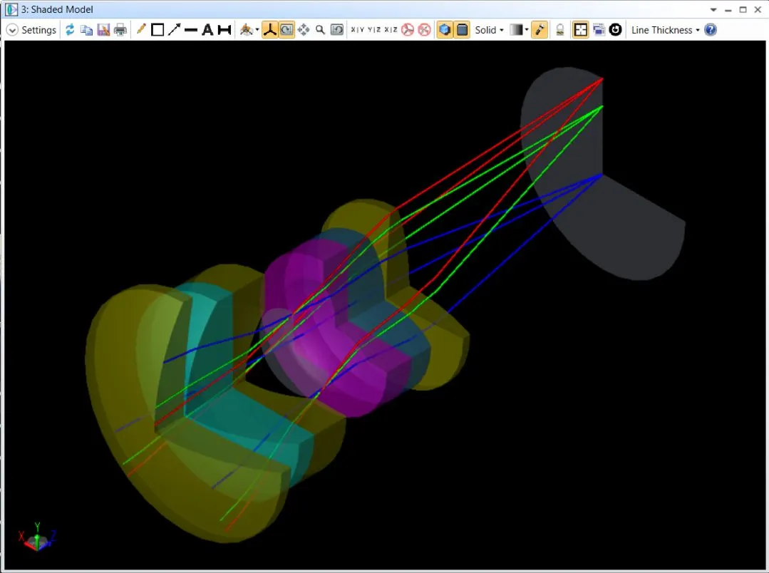 与 2D 横截面视图相比,实体模型具有一些额外的功能。例如,我们可以修改透镜的颜色和透明度。我们还可以更改模型的方向和应用截面视图。