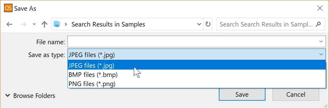 导出格式选项为 PNG、BMP 和 JPG。选择其中任一格式将调用 Windows“另存为”窗口,您可以在其中以所需的名称保存文件到所需的目录。