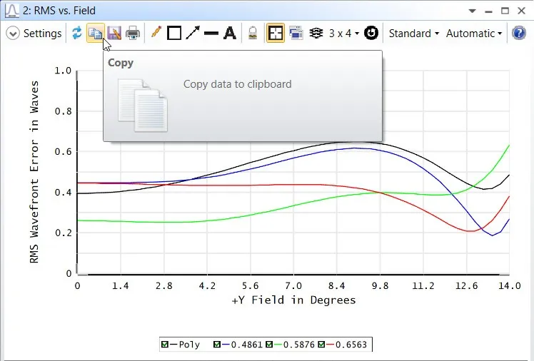 一个极其有用的 Windows 功能是剪贴板。剪贴板是图表和文本的“等候区”。使用剪贴板的好处是几乎所有 Windows 程序都可以导入或导出到剪贴板。要使 OpticStudio 图表进入剪贴板,您可以右键点击图像并选择“复制图片”。分析窗口的工具栏中也包含“复制”功能: