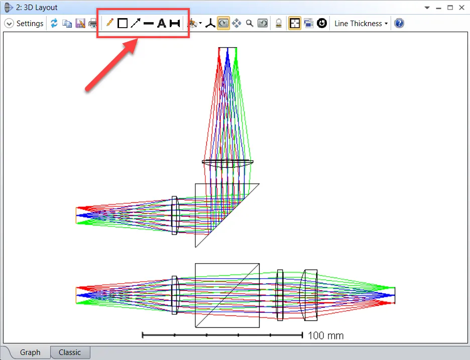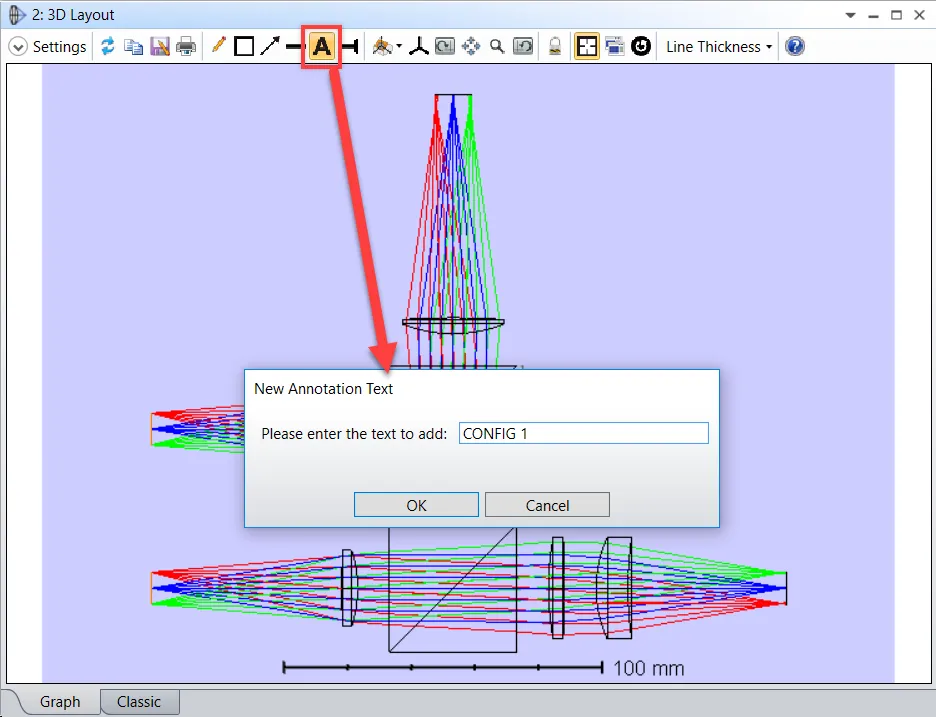 您可以从 OpticStudio 导出图表并在外部软件中添加注释,也可以通过便利的注释功能直接在 OpticStudio 中添加注释。除了注释编辑器,注释功能还支持线、箭头、文本和方框命令。