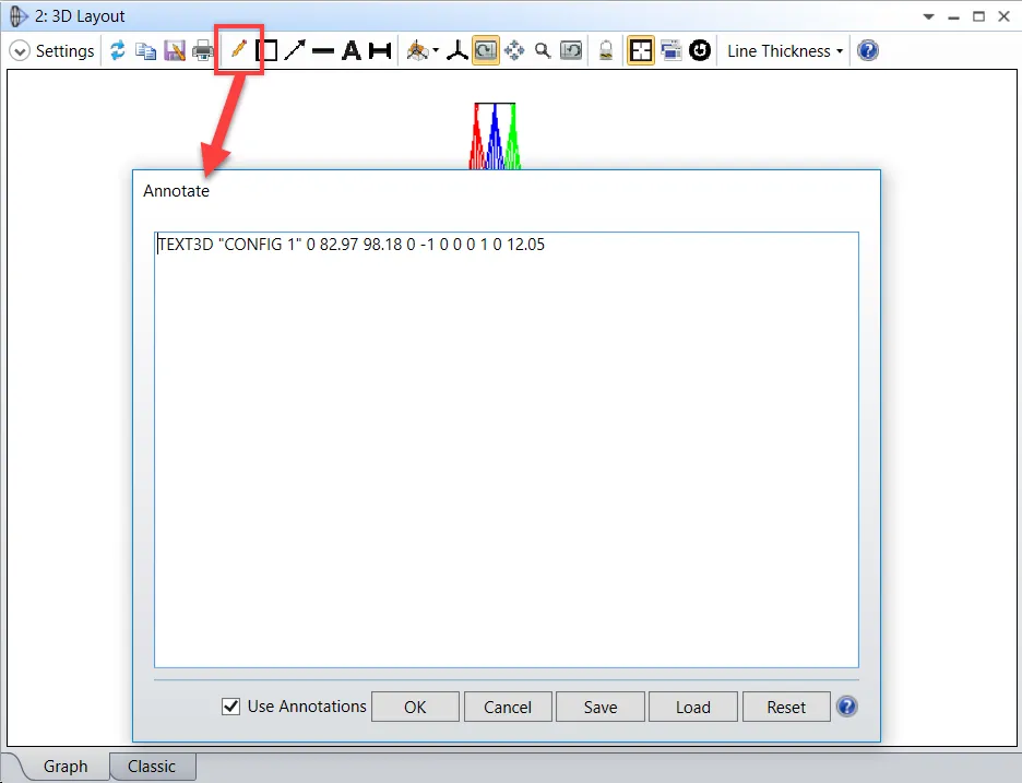 要编辑或移除新创建的注释,可以使用注释编辑器。编辑器用工具栏上的铅笔图标表示。注释编辑器采用文本编辑器的形式,以其文本语法形式列出每条命令。这样可以更精确地控制线和文本的确切位置、控制文本字体,并且能够添加更复杂的注释。