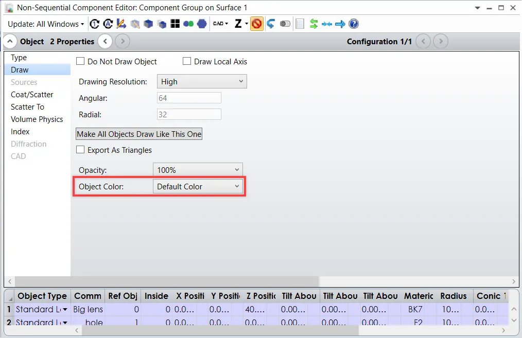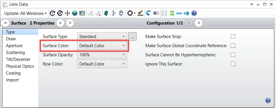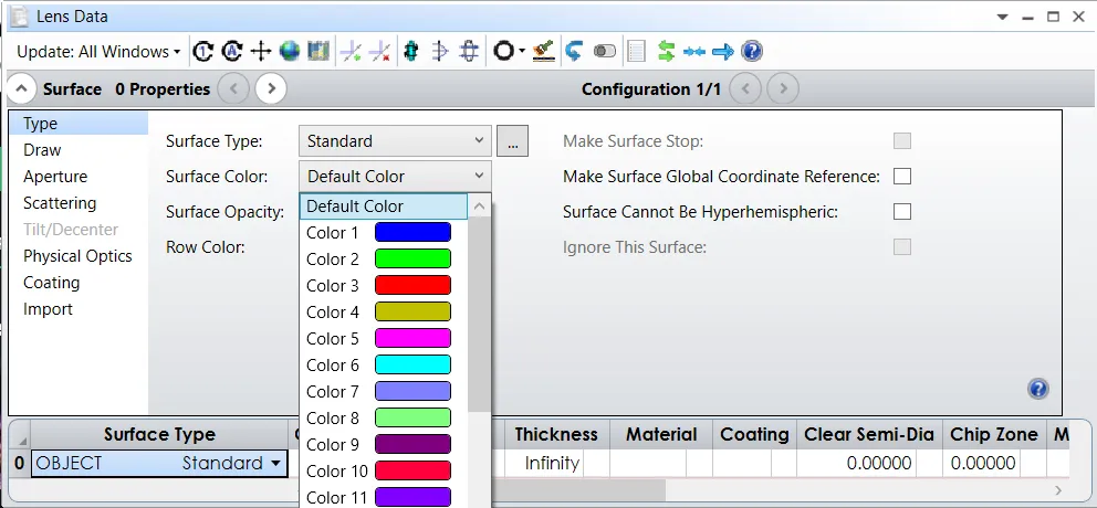 在“表面属性...‘类型’选项卡”(序列)和“物体属性...‘绘图’选项卡”(非序列)对话框下,您可以分别通过“表面颜色”和“物体颜色”的下拉菜单来更改表面和物体颜色。