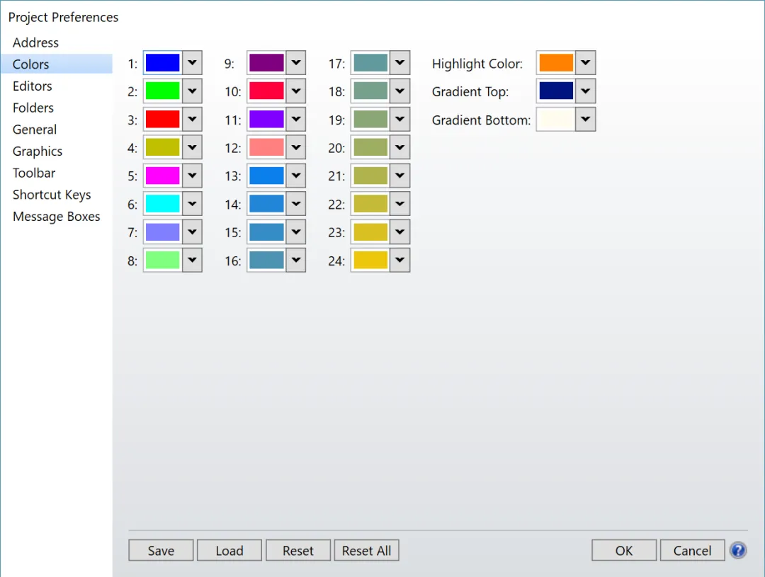 您可以在“设置...系统选项...颜色”中控制这些颜色。每种颜色都由红、绿、蓝三原色值(从 0 到 255)的组合来表示。要更改颜色,只需输入所需的红、绿、蓝值。
