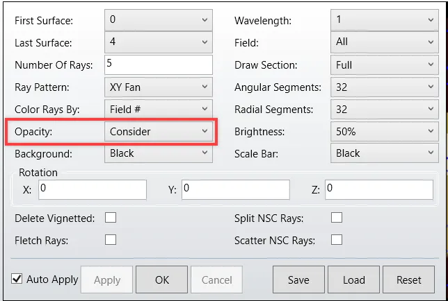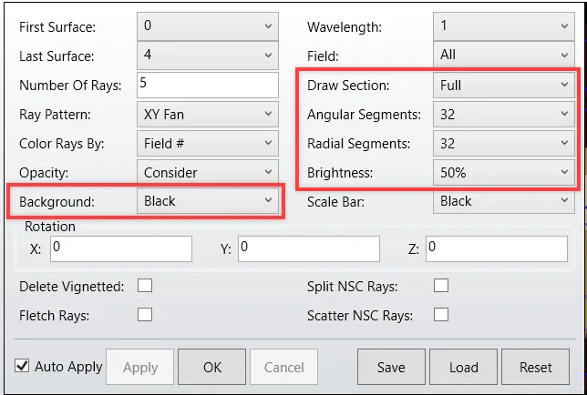 实体模型和 NSC 实体模型具有许多其他设置,可用于更改示意图的外观。对于序列系统的实体模型,有用于剖面绘图、径向段数、角向段数、亮度、背景和透明度的设置。