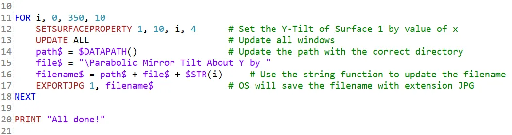 下面的宏在反射镜处于 FOR 循环之前设置坐标间断表面上的 Tilt About Y 参数。对于每个倾斜值,实体模型窗口会更新并以不同的文件名导出为 JPG 文件。