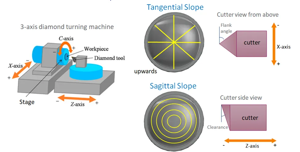 另一个参数是 “弧矢斜率” 角度。当我们在三轴金刚石车床上加工自由曲面时,刀具在工件的每一圈都沿 Z 轴来回移动,以加工非旋转对称形状的透镜。在这种情况下,刀具的后角限制了表面沿镜头上每个圆圈变化的速度,这称为弧矢斜率。更准确地说,刀具在表面上产生螺旋轨迹,但螺旋的步长非常小,在大多数情况下,可以将刀具轨迹视为一系列圆圈。对于旋转对称镜片,弧矢斜率刚好为零。