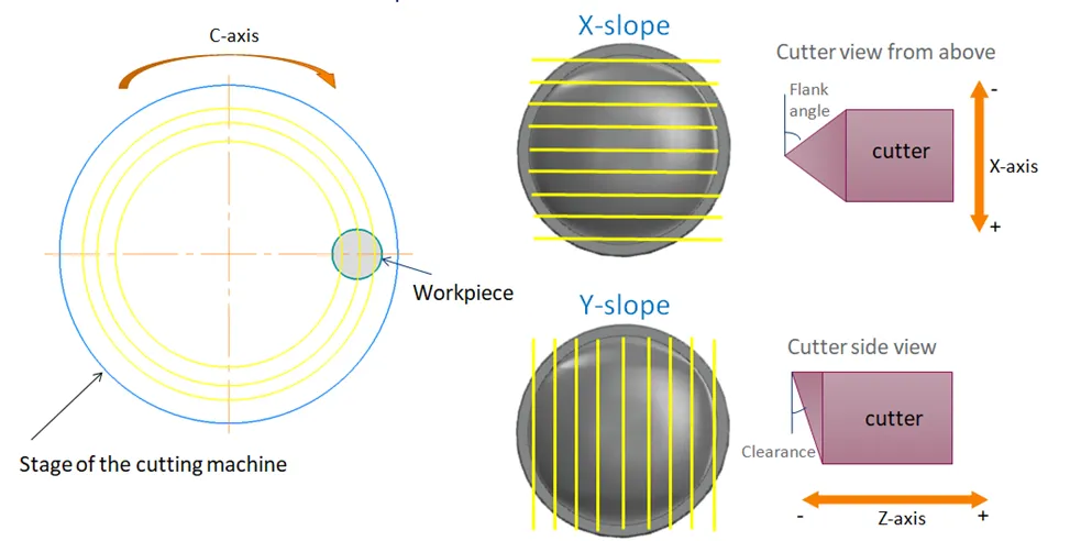 有时,从加工的角度来看,将工件放置在平台的旋转轴之外而不是沿轴放置是合理的,这样刀具在工件上的轨迹看起来几乎是直线。在这种情况下,我们应该控制所谓的 “X斜率” 和 “Y斜率”(图3)。