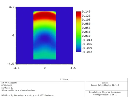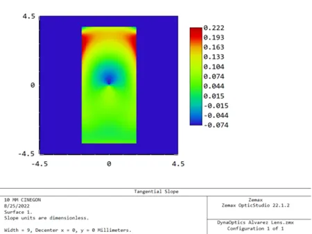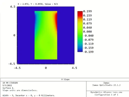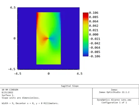 让我们看看如何在 Zemax OpticStudio 中控制这些参数。例如,我们采用一个平面对称的自由曲面镜头,即所谓的 Alvarez 透镜。进入 OpticStudio 分析 -> 表面 -> 表面斜率,可以检查整个表面的斜率分布。此分析功能可以将表面的子午、弧矢、X 和 Y 斜率显示为 2D 颜色、等高线图或 3D 曲面图。