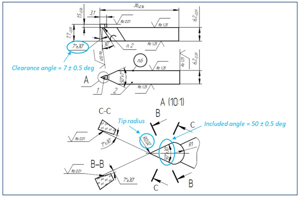 假设我们有以下来自制造商的刀具图纸(图 6)。对于我们在此基础上的光学元件设计,重要的是要了解刀具后角和侧面角。