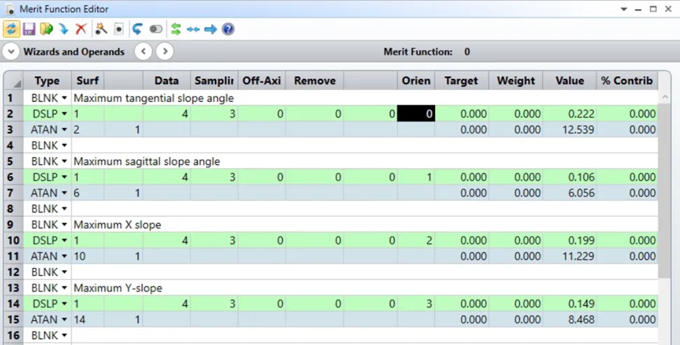 OpticStudio 具有 DSLP 操作数,可以添加在评价函数编辑器中,以便在优化期间控制表面的倾斜角度。DSLP 操作数具有各种参数和不同的输出,您可以在 OpticStudio 用户手册中找到更多信息。下图(图 7)显示了如何获得子午、弧矢、X 和 Y 斜率的最大值。