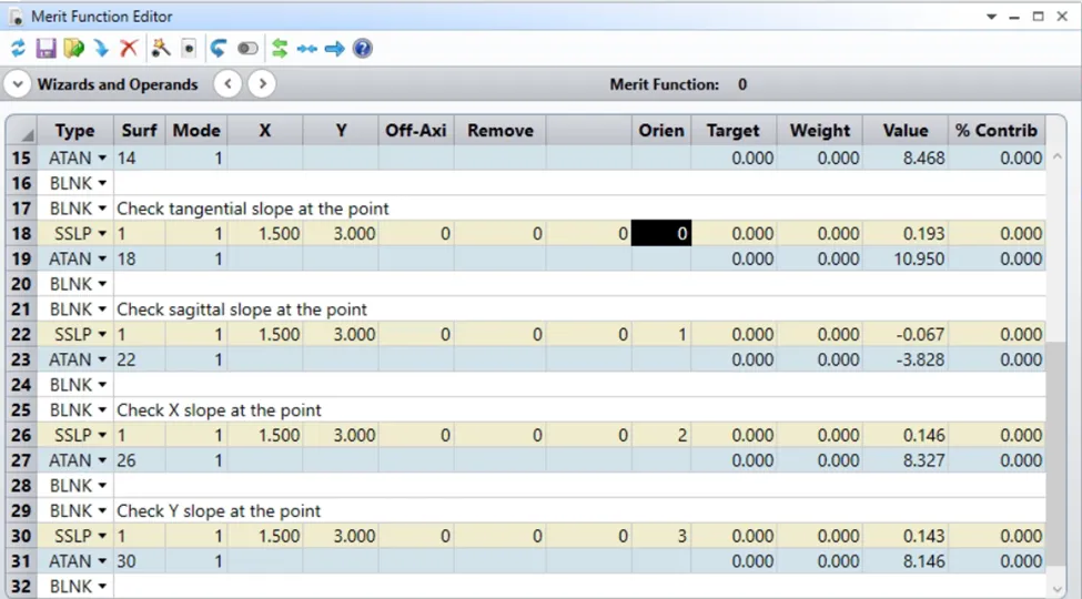 同样在 OpticStudio 中,我们可以使用 SSLP 操作数(图8)在表面上的精确坐标处获得子午、弧矢、X 和 Y 斜率的值,以控制表面精确点的斜率。
