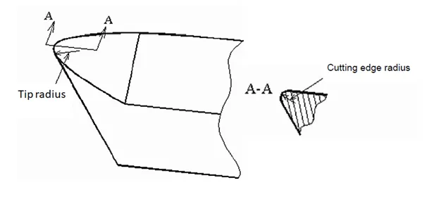 如果我们仔细观察刀具的尖端,我们会发现它实际上不是一个点,它的刻面呈圆形,其特征可由尖端半径表示。而在另一个方向(参见图 9 中的横截面 A-A),刀尖特征可由切削边缘半径表示。
