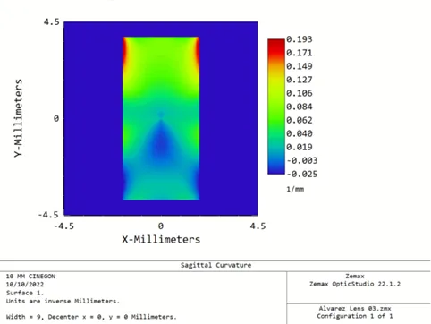 如果进入 OpticStudio 分析 -> 表面 -> 曲率,我们可以检查整个表面的曲率分布。此图将曲面的子午、弧矢、x 和 y 曲率显示为 2D 彩色、等高线图或 3D 曲面图(请参阅 OpticStudio 用户手册了解更多详情)。局部半径和曲率之间的关系很简单: