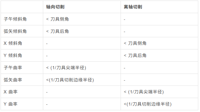 在轴向切削的情况下,表面的最大子午局部半径必须大于刀具尖端半径,最大弧矢局部半径必须大于刀具切削边缘半径。