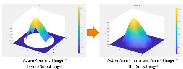 为了将镜头放置在镜筒上,我们应该在 Alvarez 镜头上添加一个法兰。由于我们的 Alvarez 透镜超出考察孔径之外的形状过于激进,我们应该用一些平滑的过渡区域来代替它,该区域将连接通光的考察区域和法兰。在 DynaOptics 的应用案例中,使用自己的软件 uVo,它可以自动创建这样的过渡区域。我们只需指定法兰 Z 位置以及表面和法兰之间的径向间距,uVo 将自动创建一个平滑的过渡区域(图 13)。