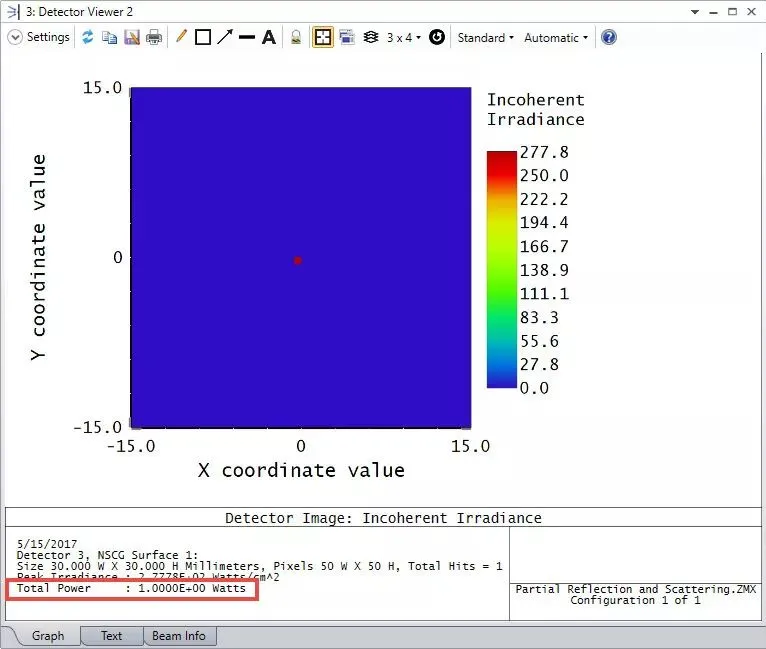 通过不考虑偏振的蒙特卡洛光线追迹,单根光线照明了探测器最中间的像素并且该像素接收到的功率为1W。