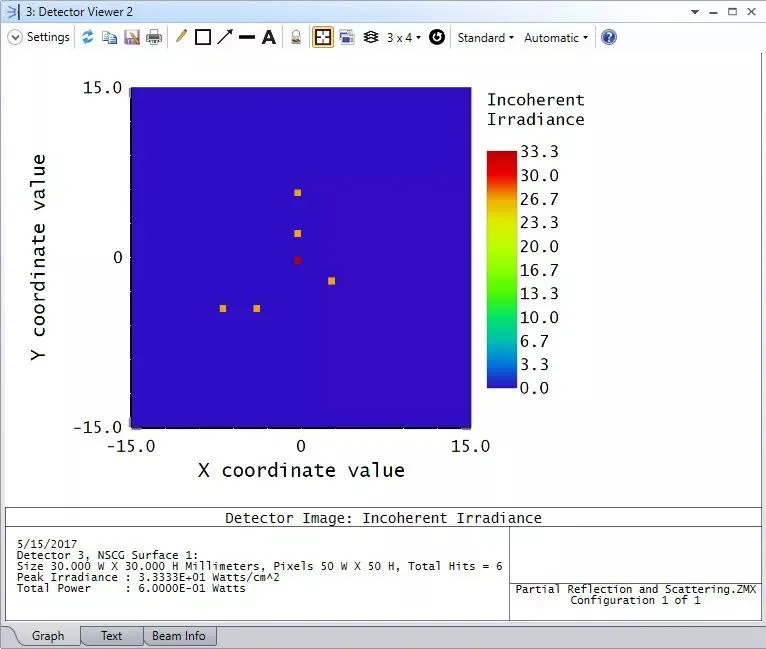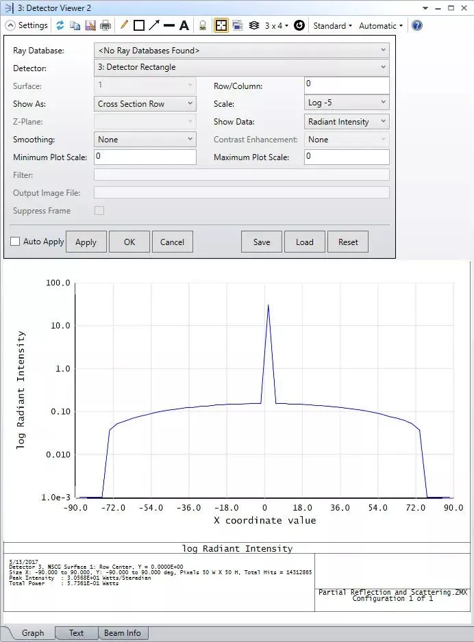 对于本例来说,分别设置散射函数和光线数为0.8和5。因此,当开启光线分裂功能时,散射能量(在考虑膜层首先造成的损耗之后,入射光能量的80%)将平均的分配到5根散射光线上。而对于镜面反射的光线,其能量为入射光线的总能量的(1-散射函数)%。