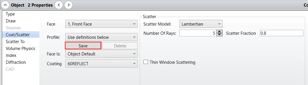当完成了当前表面的膜层/散射设置后,点击保存按钮即可完成设置参数的保存。