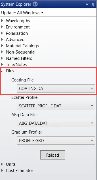 这个膜层可以应用在任何使用当前膜层文件的 OpticStudio 设计当中,您可以在系统选项 (System Explorer) > 文件 (Files) 中查看当前系统的镀膜文件:
