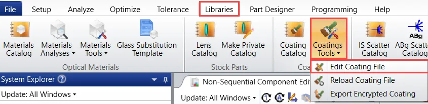 点击数据库 (Libraries) > 膜层工具 (Coatings Tools) > 编辑膜层文件 (Edit Coating File) 打开镀膜文件 COATING.DAT。文件中包含多种简单的理想膜层,但是其中并没有符合我们在前文中假设的透射和反射比的膜层。