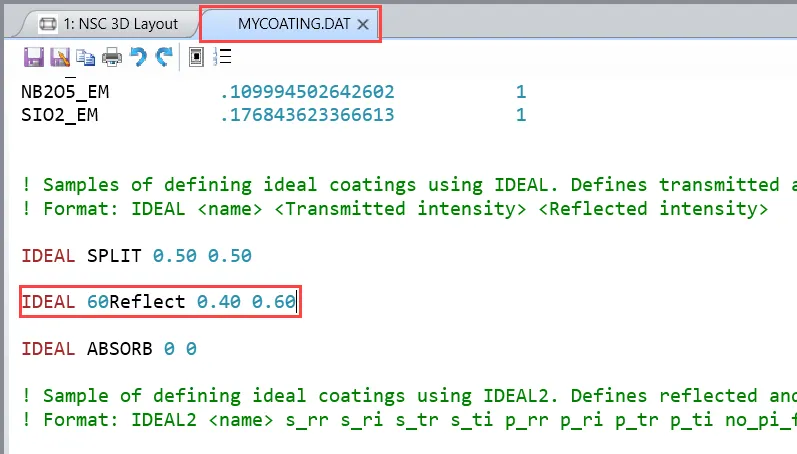 如果我们想定义一个40%透射60%反射的膜层,并且该系数与波长及入射角无关,我们可以使用以下语句进行定义:IDEAL 60Reflect 0.4 0.6