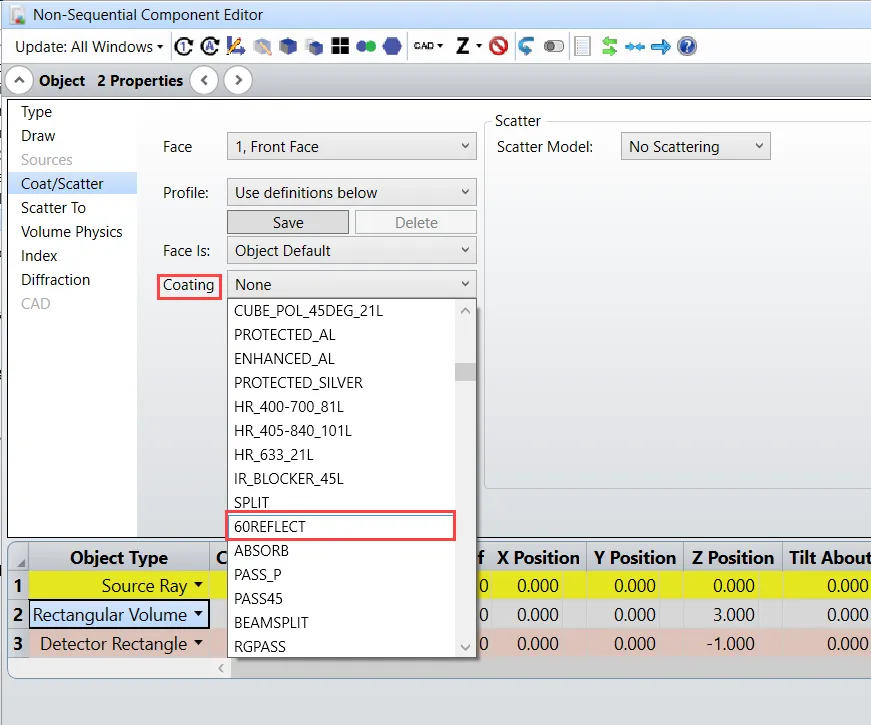 默认情况下,物体的任何表面都没有定义膜层。对于矩形体的前面,通过下方的膜层 (Coating) 下拉菜单选择新创建的理想膜层 60REFLECT: