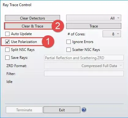 在选择了合适的膜层之后,点击OK将膜层添加到物体表面上并退出物体属性菜单。为了证实膜层已经被使用并正确工作,我们可以运行光线追迹(勾选使用偏振 (Use Polarization) 选项)来进行验证。