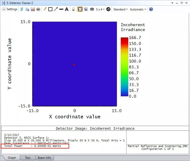 并且,如果我们执行另一次蒙特卡罗光线追迹,这些光线(5根散射光线都落在探测器上时)的总能量将始终为0.6W,也就是入射光能量的60%。