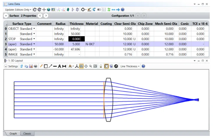 本文所考虑的系统(StartingLens.zmx)由一个简单的双凸透镜组成,工作波长为0.633 nm,像平面位于其近轴焦点处。