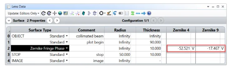 “ OFHSphericalCorrector_1.zmx ”是构造文件 1,只包含一个准直光束入射透镜。“ OFHSphericalCorrector_2.zmx ”是构造文件 2,它类似于构造文件 1,但另外包含一个位于透镜前表面前的相位板。该相位板使用 Zernike Fringe 相位表面 (Zernike Fringe Phase surface) 建模,该表面的所有项最初都被设为零。将分别表示离焦和三阶球差的第 4 项和第 9 项设为变量,以便以后进行适当的优化。