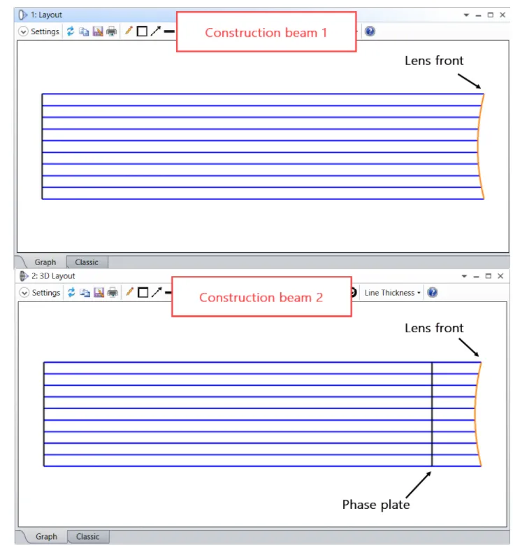 上图是两个构造文件只绘制到镜头的前表面的布局图,这也是每个文件中的系统光阑。光阑代表假定的两个构造光相互干涉的表面,只有在构造文件中光阑位置处的光线交互位置的向量才能决定全息图的属性。从 OFH 的角度来看,构造文件中所有在光阑后的表面都将被忽略,所以光阑后的表面在布局图中为了清晰显示都被隐藏了。