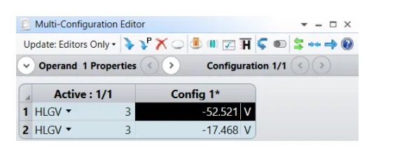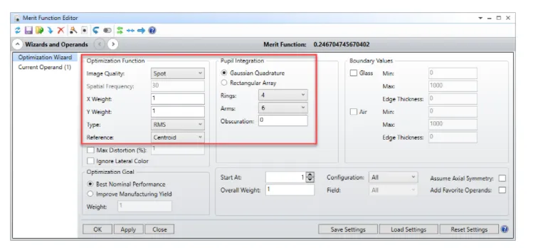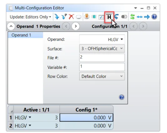 增加全息变量 (Add Hologram Variables) 可以在构造文件中查找变量,并将它们作为 HLGV 多重结构操作数添加到重现文件中。这些变量现在可以与重现文件中的任何其他变量一起使用(如果有的话)。在本例中,将添加4个 HLGV 操作数,2个用于构造文件1,2个用于构造文件2。我们只对构造文件2的操作数感兴趣(它已经应用了变量求解 'V'),所以删除构造文件1的操作数。使用 HLGV 操作数允许同时优化构造和重现系统。注意, HLGV 报告的变量不是只读的,更改它们的值将更改构造文件中的相关参数。为了优化系统以获得最佳性能,将使用以最佳 RMS 光斑尺寸为评价函数目标。为此,按如下方式设置优化向导,然后单击 OK: