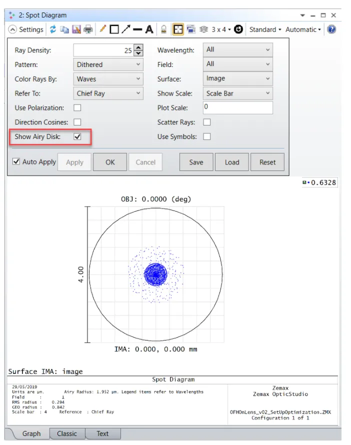显示艾里斑 (Airy disk) 的标准点列图,可以用来快速确认该系统现在是否处于衍射极限。由于存在高阶像差,该点不是一个理想的像点。