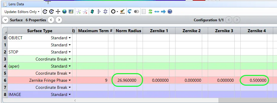 图 3:在镜头数据编辑器的第 5 行和第 6 行中插入 Zernike 条纹相位面。