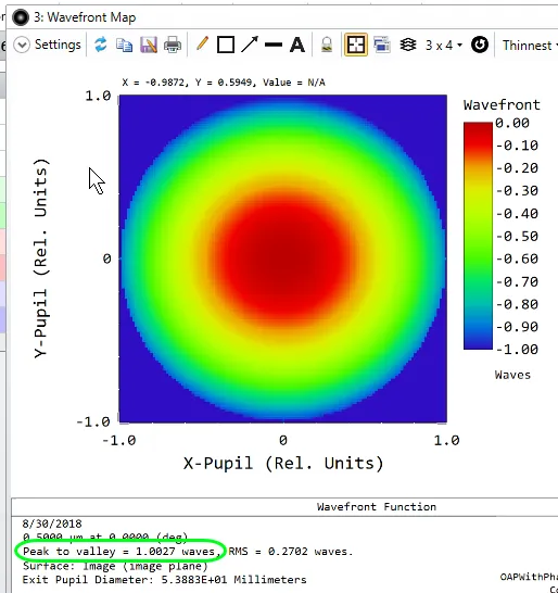 半径ρ通过Zernike表面的Norm Radius列设置的归一化半径进行归一化处理,应该设置为略大于零件通光口径的值,如下图所示。Z4系数的单位是wave。将Z4设置为0.5时,可以计算出在ρ=1时,添加的波前峰谷值应为1wave。
