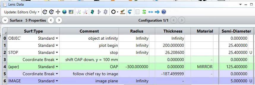 初始OAP(离轴抛物面)设计如下图所示。其中OAP的直径为50.8mm,焦距为-187.5mm,光束发散角为-36.9°。其中,位于OAP的前表面边缘位置处的光阑用于阻挡多余的光线。此外,设置了两个坐标断点:其中一个用于将主镜向下移动,以便调整光路;另一个用于使像面与主光线对准。